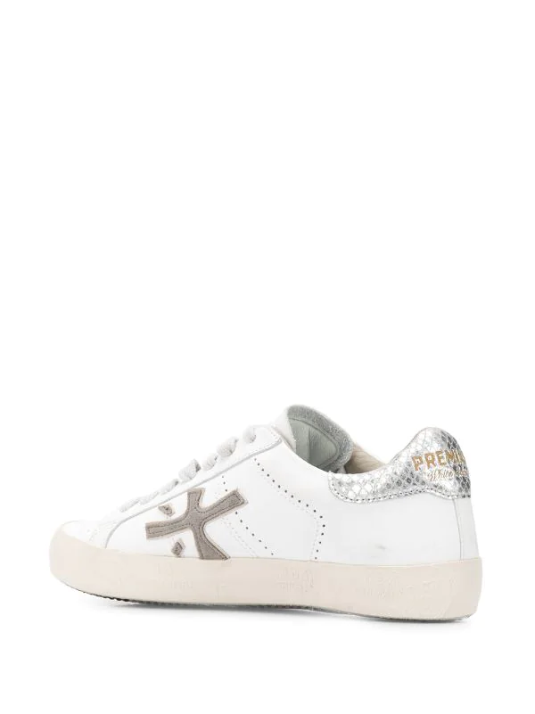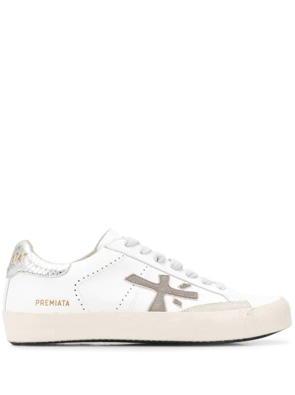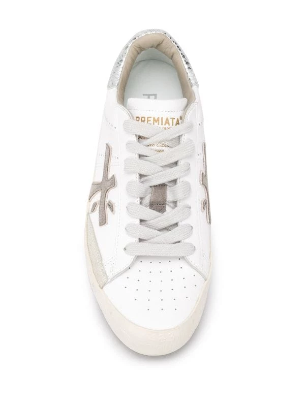 ‚Steven‘ Sneakers von White Premiata. Merkmale: Logo vorne und an der Seite, Schnürung vorne, Logo-Prägung im Fußbett, runde Kappe und weiße Gummisohle.
