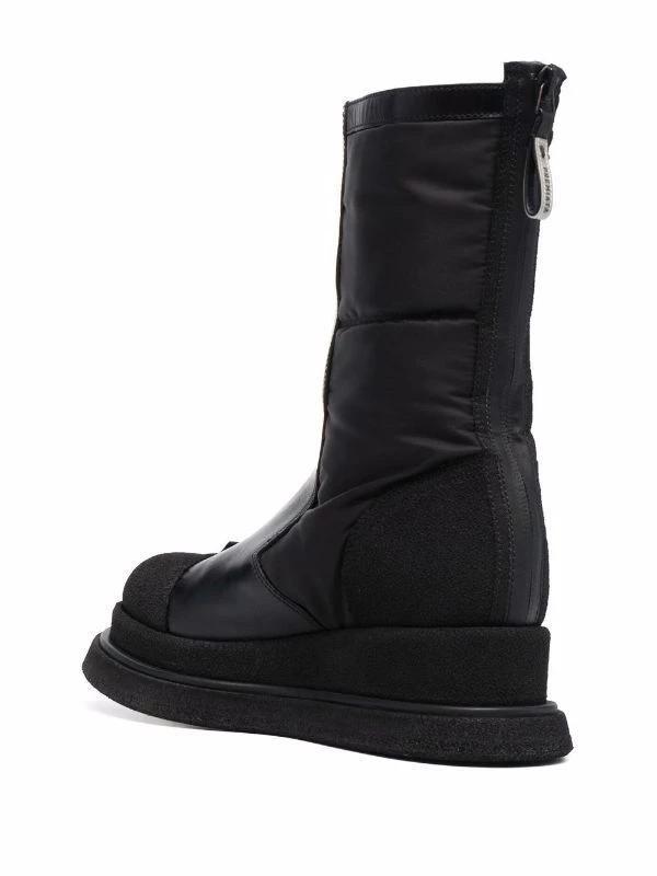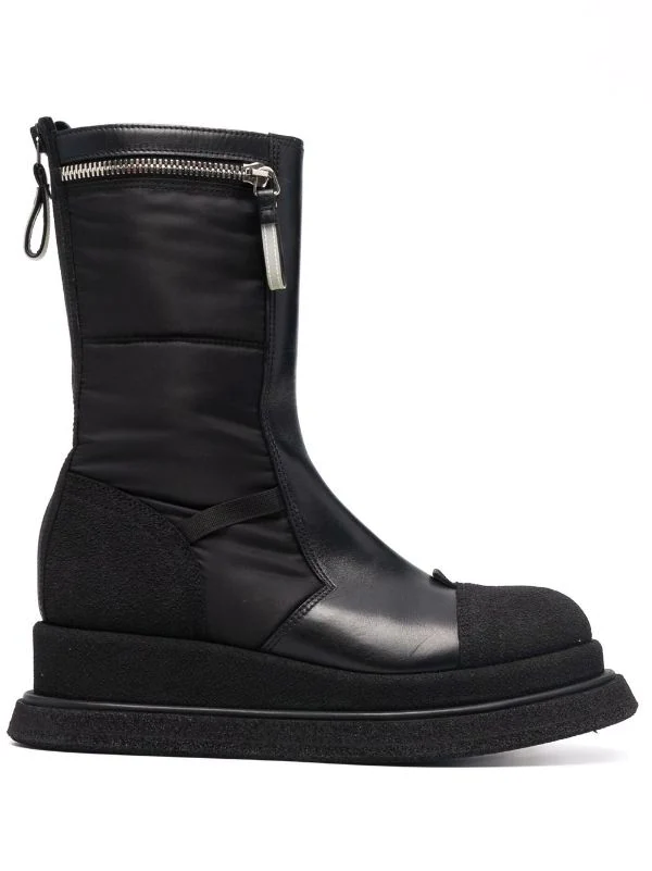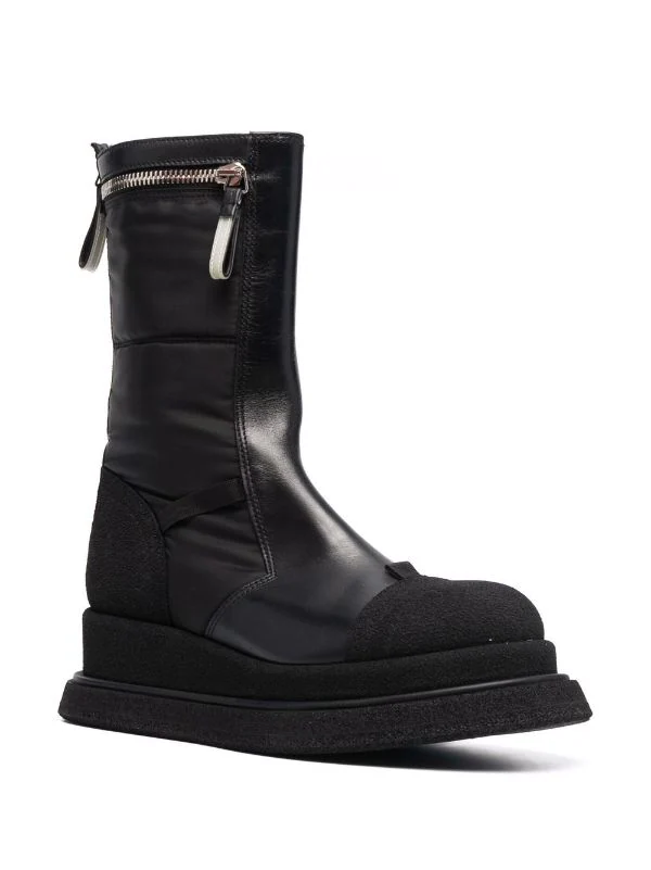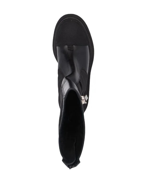 Silberfarbene Beschläge, seitlicher Reißverschluss, runde Kappe, niedriger Blockabsatz.
