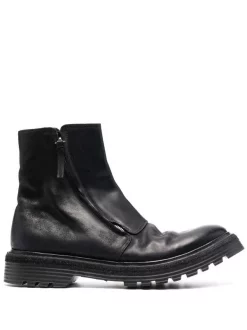 Silberfarbene Beschläge, Reißverschluss an der Seite, runde Kappe, niedriger Absatz.