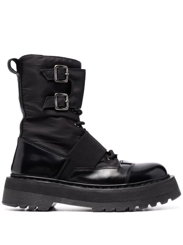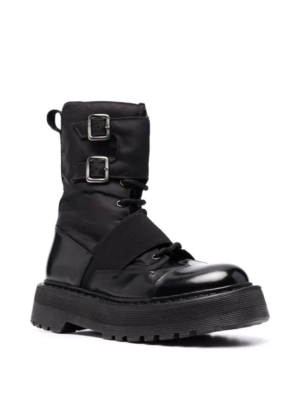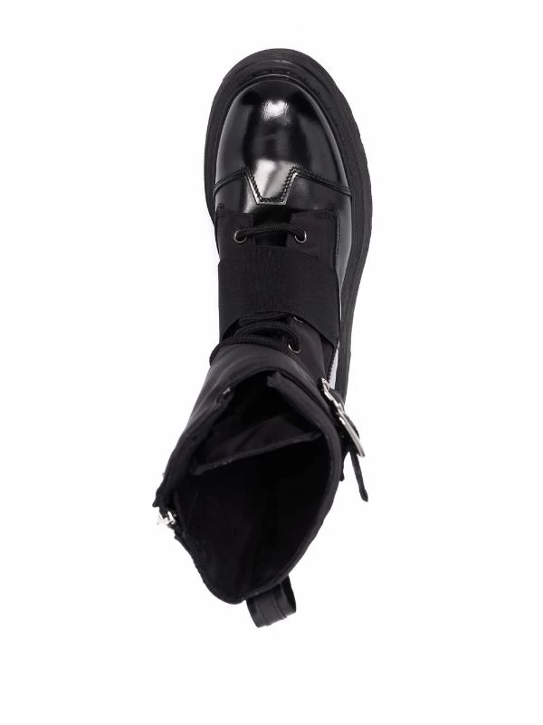 Kontrastdetails, runde Kappe, Schnürung vorne, Klettverschluss vorne, Schnallenverschluss am Knöchel, seitlicher Reißverschluss, Lasche an der Ferse, klobige Gummisohle. Farbe: Schwarz. Material: Kalbsleder.