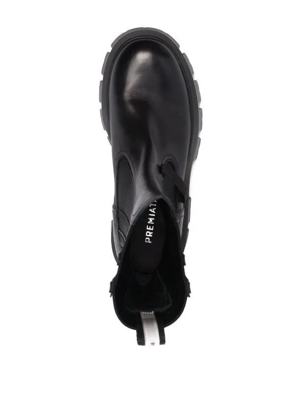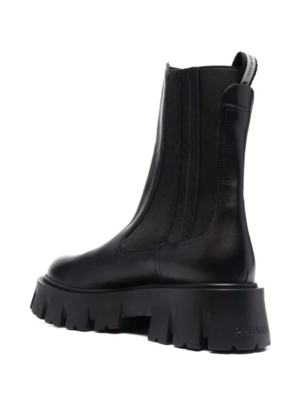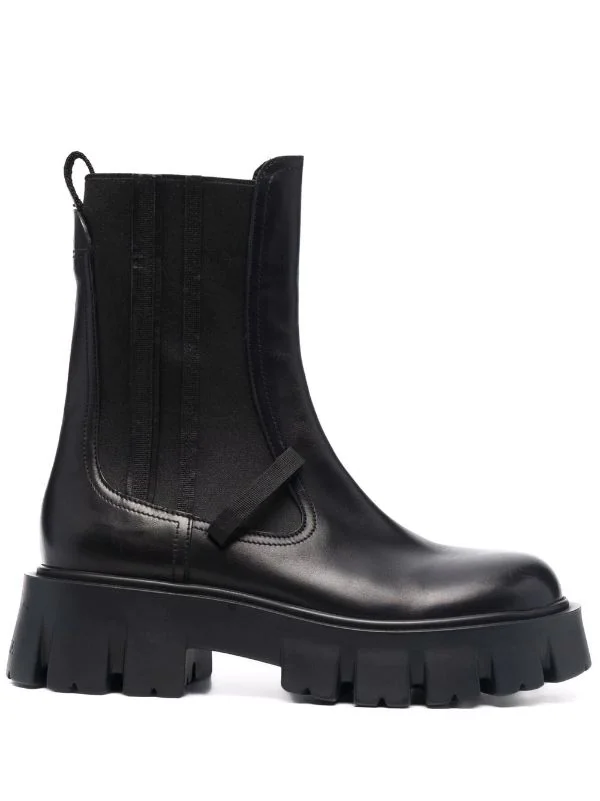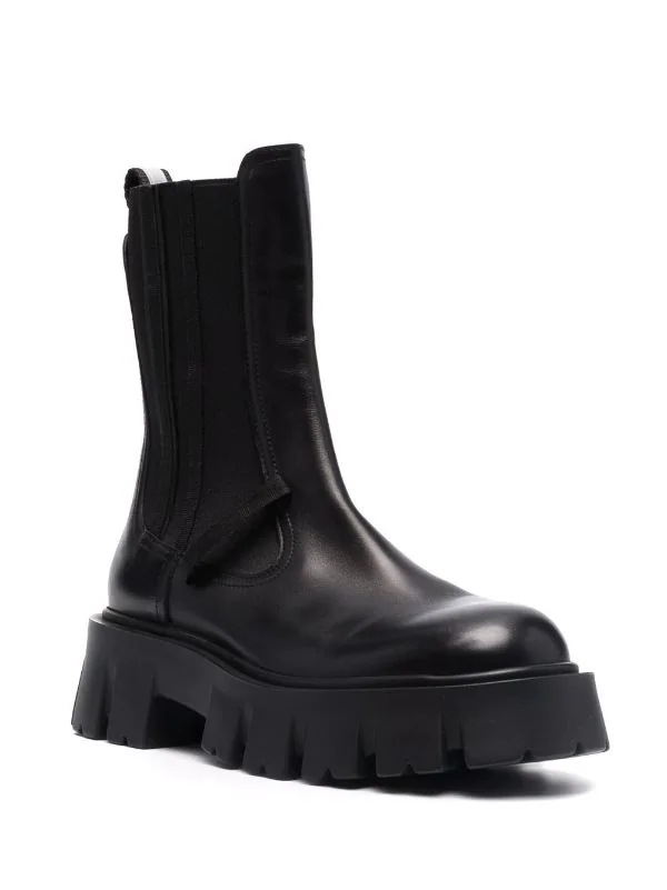 Schwarz, Kalbsleder, Logo-Etikett, Stretcheinsätze an den Seiten, knöchelhoch, ohne Verschluss, runde Kappe, klobige Gummisohle.