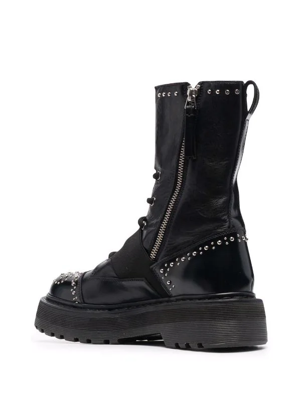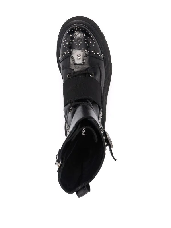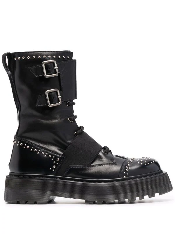 Runde Kappe, silberfarbene Nieten, Schnürung vorne, Doppelschnalle, seitlicher Reißverschluss, Lasche an der Ferse, Logo-Prägung im Fußbett, klobige Gummisohle. Farbe: Schwarz. Material: Kalbsleder.