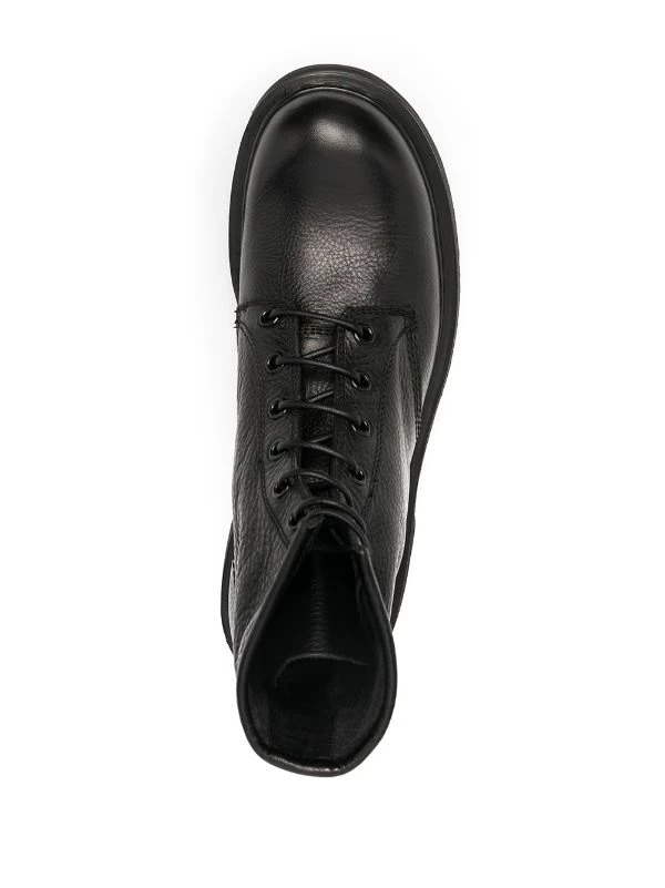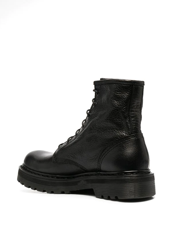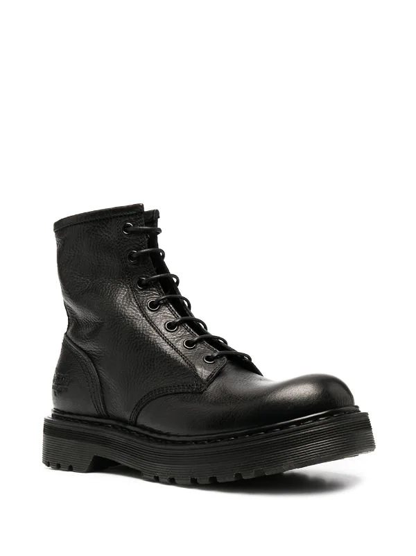 Schnürung vorne, runde Kappe, polierter Effekt, klobige Gummisohle, Futter aus Leder. Farbe: Schwarz. Material: Leder.