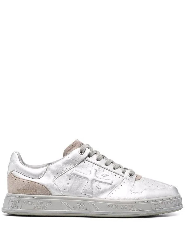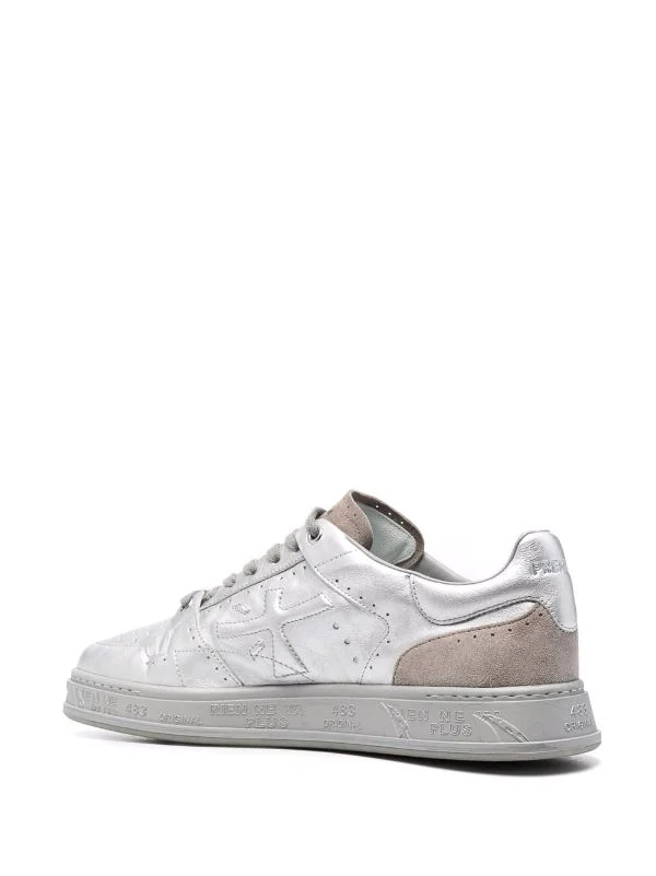 Metallic-Look, Kontrastdetails, Wildleder-Einsätze, Zunge mit Logo-Print, perforiert, runde Kappe, Schnürung vorne, Logo an der Fersenkappe, Logo-Prägung im Fußbett, flache Gummisohle. Material: Kalbsleder.